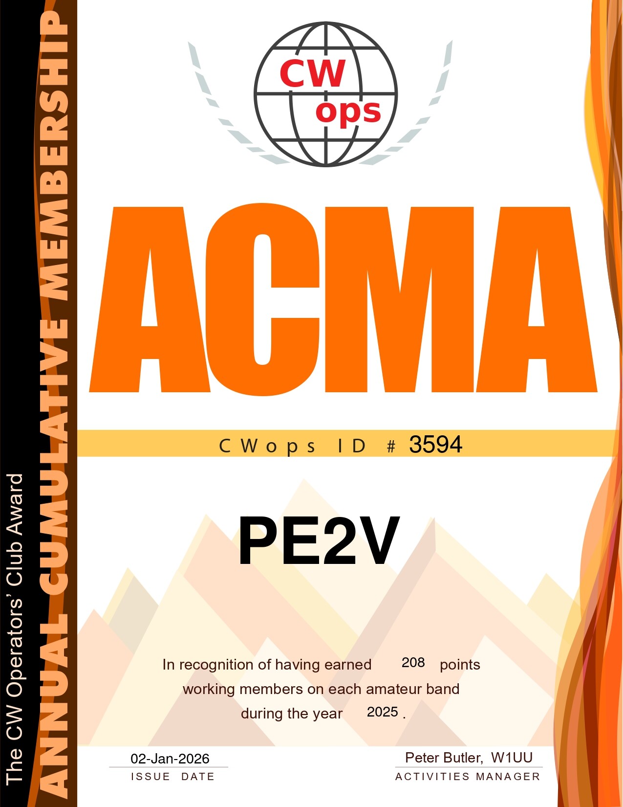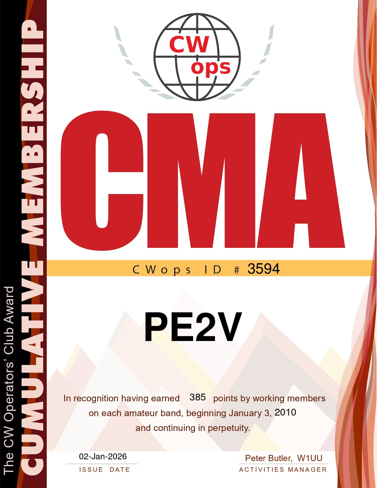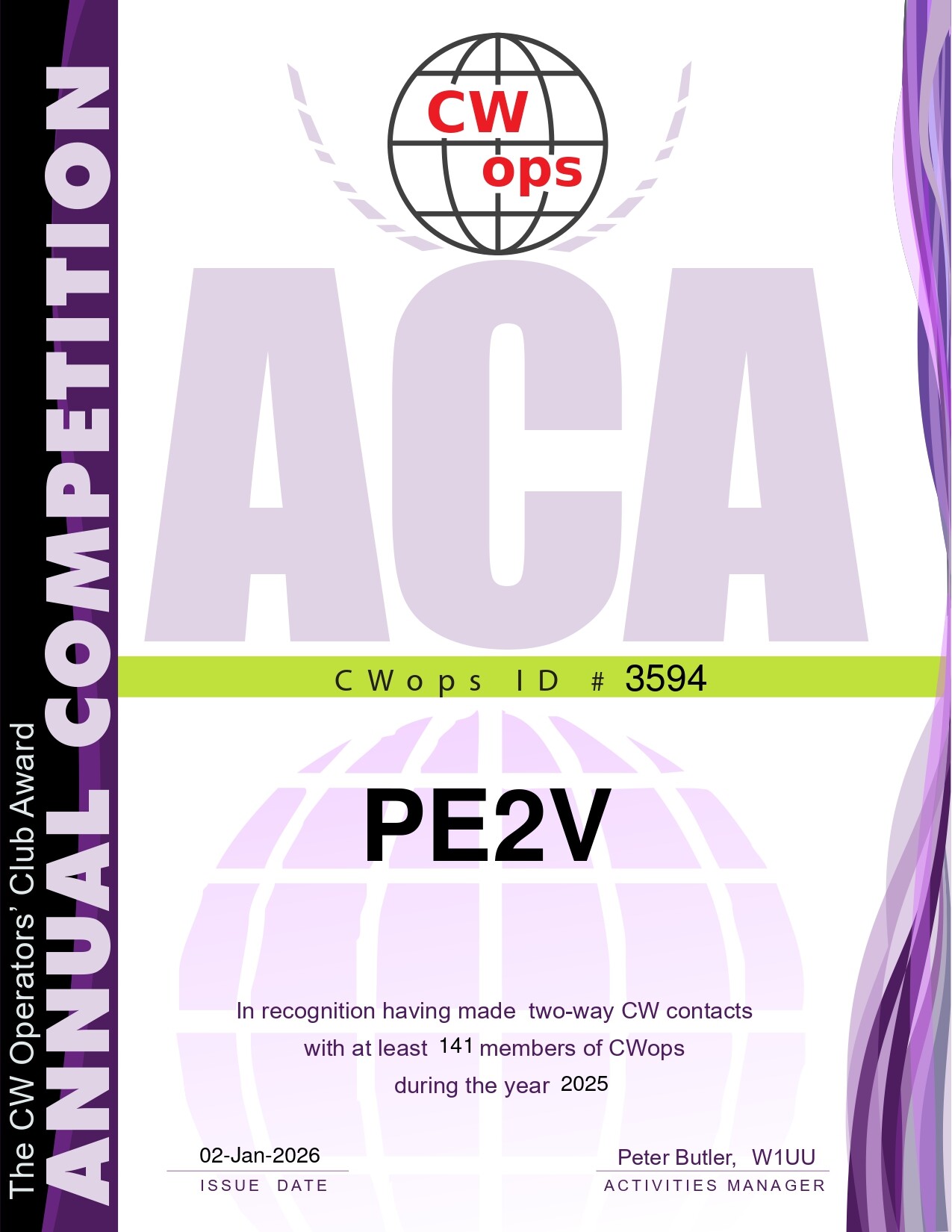 Om in aanmerking te komen voor deze award, moeten CWops leden QSO’s maken met CWops leden die opereren vanuit elk van de 40 CQ Zones, één QSOP per zone. Elk QSO moet een CW-QSO zijn met een actief CWops lid. Dit is een doorlopend certificaat. Mijn stand: In 2024: 10 en in 2025 is de stand: 13.