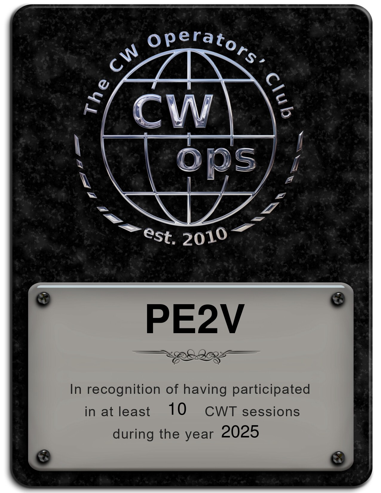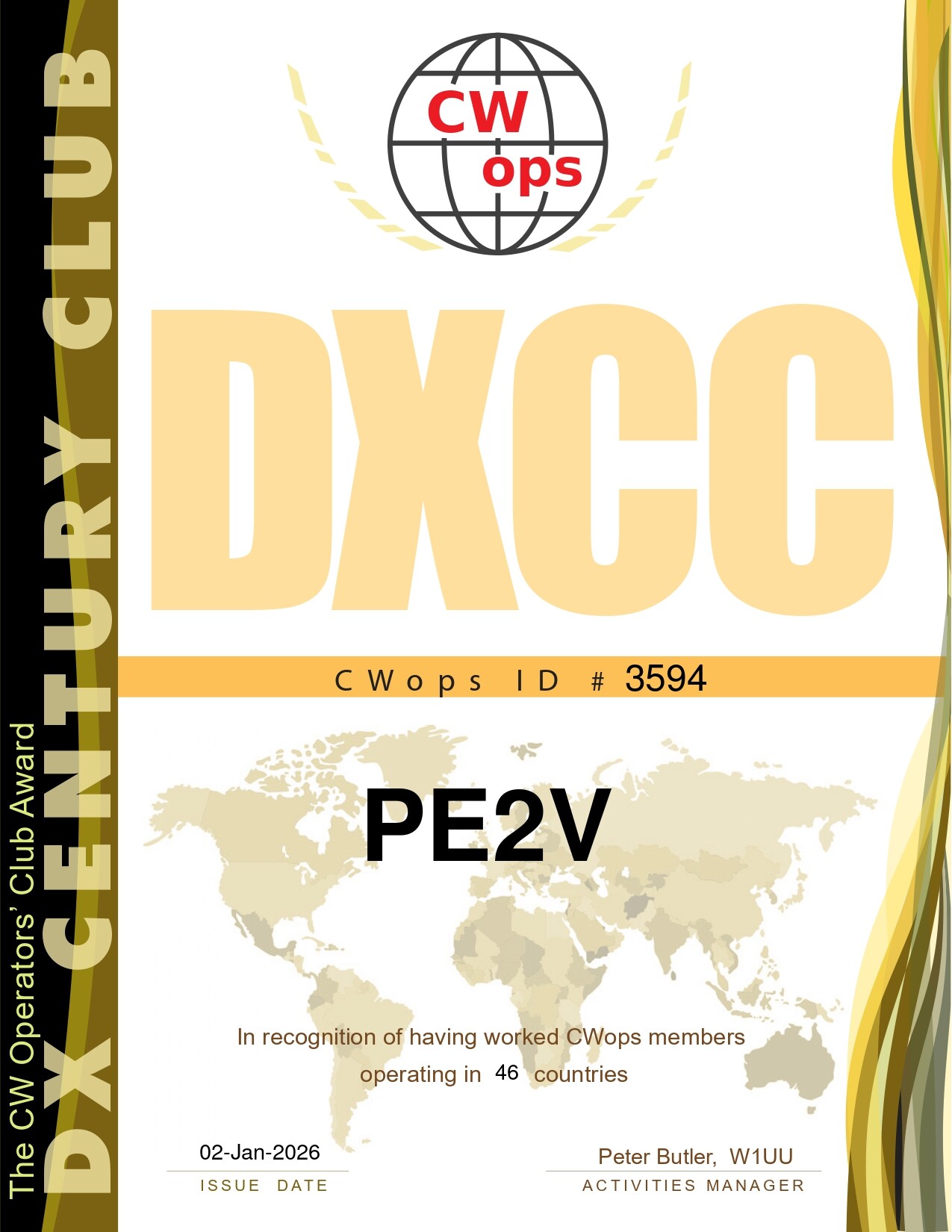Om in aanmerking te komen voor deze onderscheiding moeten CWops leden QSO’s maken met CWops leden in ten minste 100 entiteiten die voorkomen op de ARRL DXCC Entiteiten Lijst. Eén QSO per land telt mee voor deze award en elk QSO moet een CW-QSO zijn met een actief CWops lid. De award wordt uitgereikt voor ALLE BANDEN of voor een enkele band. Dit is een doorlopend certificaat. Mijn stand: In 2024: 35 en in 2025 is de stand: 46.