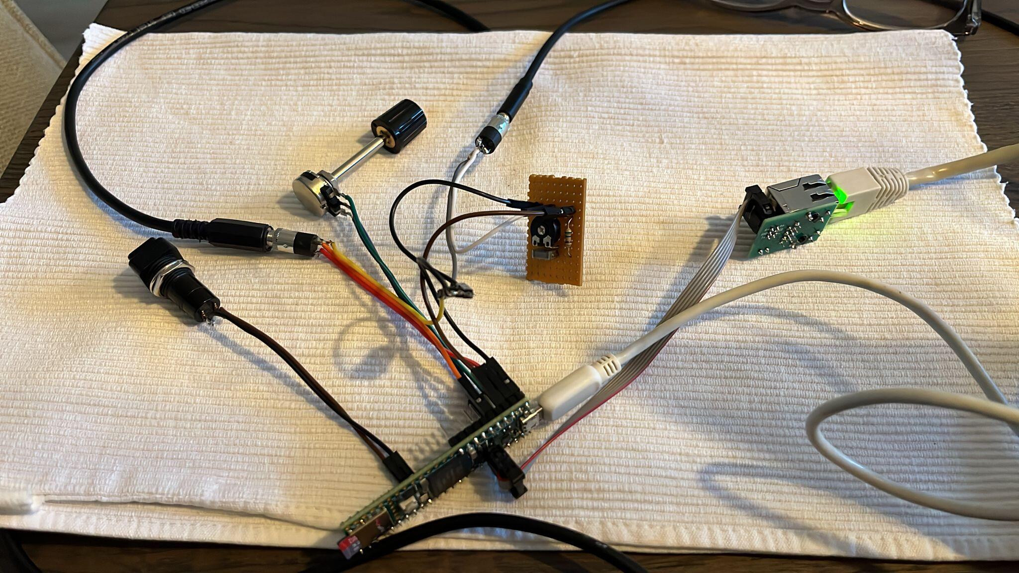 Een Teensy met client MorCoNI, een paar connectoren, een potmeter en UTP interface is het enige dat nodig is bij de client computer.